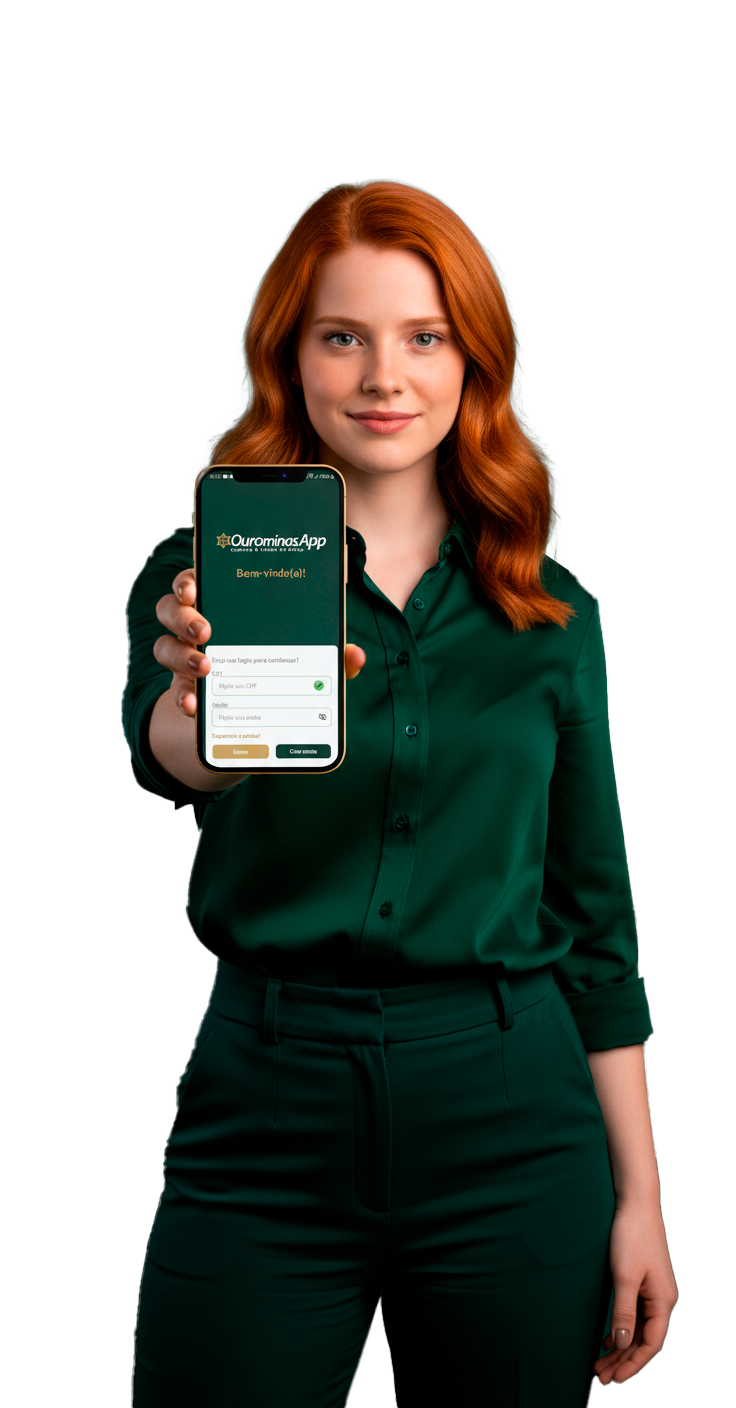 Baixe o OurominasApp, através das lojas Apple Store ou Google Play Store, instale e crie a sua conta, de forma rápida e segura, através do botão criar conta.